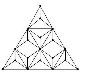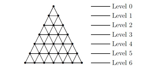 Definition 2.10. [13] The triangular grid graph \(T_n\) is the graph on vertices \((i, j, k)\) with \(i, j, k\) being non-negative integers summing to \(n\) such that vertices are adjacent if the sum of absolute differences of the coordinates of two vertices is 2.