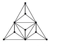 Replace each \(K_3\) subgraph of \(T_n\) with a tetrahedron. This network is known as the \(n-\)dimensional triangular silicate network [9]. An \(n-\) dimensional triangular silicate network is denoted by \(TSN(n).\) The graph triangular silicate network, \(TSN(3)\) is shown in Figure 2.9. The number of vertices in triangular silicate network \(TSN(n)\) is \(\left[\frac{(n-1)(n-2)}{2}\right] + 3n(n+1)\).