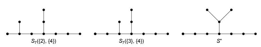Let \(n \ge 5\) be an integer, and let \(I\), \(J\) be subsets of \(\{2,3, \cdots, n-1\}\) with \(J \subseteq \{3, \cdots, n-2\}\) and \(I \cap J=\varnothing\). We let \(S_{n}(I,J)\) denote the tree obtained from a path \(u_{1} u_{2} \cdots u_{n}\) of order \(n\) by adding vertices \(v_{i}\ (i \in I\cup J)\) and \(v_{i}^{\prime}\ (i \in J)\) and edges \(u_{i} v_{i}\ (i \in I\cup J)\) and \(v_{i} v_{i}^{\prime}\ (i \in J)\). Also we let \(S^{*}\) denote the tree obtained from a path \(u_{1} u_{2} \cdots u_{7}\) of order \(7\) by adding vertices \(v_{4}\), \(v_{4}^{\prime}\), \(v_{4}^{\prime \prime}\) and edges \(u_{4} v_{4}\), \(v_{4} v_{4}^{\prime}\), \(v_{4} v_{4}^{\prime \prime}\) (see Figure 1).