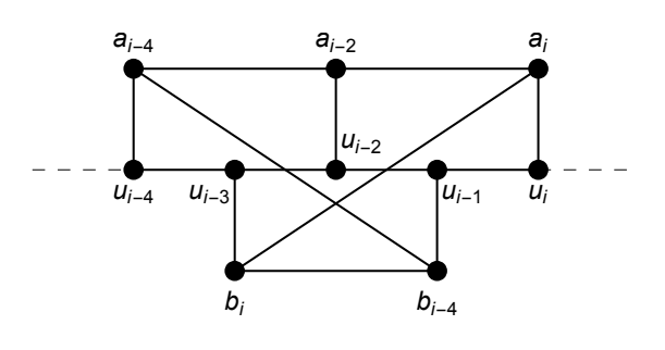 Case 1. Let \(9\le i\le d-5\) and, for \(j\in \{i-4, i-2, i\}\), let \(a_{j} \in N_{G}(u_{j})-V(P)\). Then \(a_{i-4} a_{i-2}\notin E(G)\) or \(a_{i-2} a_{i}\notin E(G)\).
