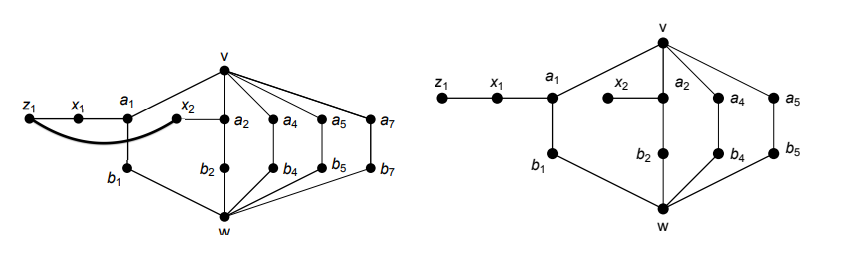 Since \(G\) is \(\{C_{3}, C_{4}\}\)-free, \(|N_{G}(z_{1})\cap \{b_{4}, b_{5}, b_{6}\}|\le 1\) and \(|N_{G}(z_{1})\cap \{a_{7}, a_{8}\}|\le 1\). We may assume that \(z_{1} b_{4}, z_{1} b_{5}, z_{1} a_{7} \notin E(G)\). Now if \(z_{1} x_{2} \in E(G)\), then it follows from (2), (5), (6) and (7) that \(\{x_{2} , z_{1}, x_{1}, a_{1}, v, a_{7}, b_{1}, w, b_{4}, b_{5}\}\) induces a copy of \(T_{1}\); if \(z_{1} x_{2}\notin E(G)\), then it follows from (2), (5), (6) and (7) that \(\{x_{2} , a_{2}, v, a_{1}, x_{1}, z_{1}, b_{1}, w, b_{4}, b_{5}\}\) induces a copy of \(T_{1}\) (see Figure 4). This completes the proof of Lemma 4.1.
