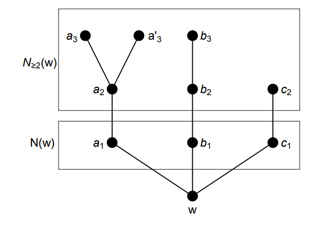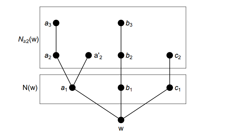 For a vertex \(u\in V(G)\) and a nonnegative integer \(d\), let \(N_{d}(u)\) be the set of vertices of \(G\) such that \({\rm dist}(u,v)=d\), and let \(N_{\le d}(u)=\bigcup_{0\le i\le d} N_{i}(u)\) and \(N_{\ge d}(u)=\bigcup_{i\ge d} N_{i}(u)\); thus \(N_{0}(u)=\{u\}\) and \(N_{1}(u)=N(u)\). Clearly \(N(w)\) is independent, \(|N(x)\cap N_{2}(w)|\ge 2\) for every \(x\in N(w)\) and, since \(|N(y)\cap N(w)|\le 1\) for every \(y\in N_{\ge 2}(w)\), we have \(\delta(G[N_{\ge 2}(w)])\ge 2\). As in [4], for \(U\subseteq V(G)\), we let \(L(U)\) denote the set of those vertices \(v\in N_{2}(w) \cup N_{3}(w)\) for which there exists a \(v\)–\(w\) path of order four avoiding \(U\). The following three lemmas hold (see [3, Section 5]).