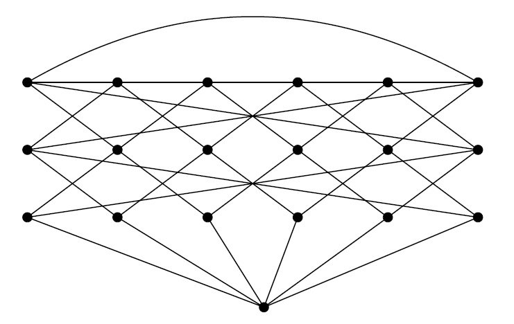 Stiebitz [20] generalized Mycielski’s construction in the following way: Given a graph \(G=(V,E)\) and an integer \(t\geq 0\), the Generalized Mycielskian graph \(\mu_{t}(G)\) is a graph with vertex set \(\{(x,i):\ 0\leq i \leq t,\ x\in V(G)\}\cup\{u\}\), where there is an edge \((x,0)(y,0)\) and \((x,i)(y,i+1)\) whenever there is an edge \(xy\in E(G)\) and an edge \((x,t)u\) for all \(x\in V(G)\). Observe that, for a connected graph \(G\) with \(|V(G)|=n\), \(\mu_t(G)\) is also connected with \(|V(\mu_t(G))|=(t+1)n+1\). Note that \(\mu_0(G)\approx G\) and \(\mu_1(G)\approx \mu(G)\). The construction for \(\mu_2(C_6)\) is illustrated in Figure 1 ahead.