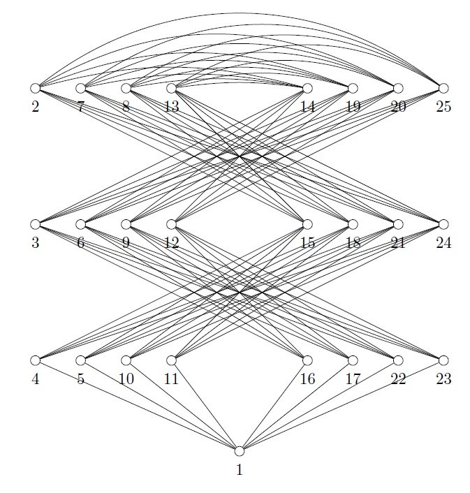 The weight of vertices \((x_p,0)\), \((x_p,t)\) where \(1\leq p \leq m\) and vertices \((y_q,0)\), \((y_q,t)\) where \(1\leq q \leq n\) are \[\begin{aligned} w(x_p,0)&=\sum_{i=1}^nf(y_i,0)+\sum_{i=1}^nf(y_i,1)\\ &=\sum_{i=1}^n\big(b_{i,1}+m(t+1)+1\big)+ \sum_{i=1}^n\big(b_{i,2}+m(t+1)+1\big)\\ &=(n^2+2mn)(t+1)+3n,\\ w(x_p,t)&=\sum_{i=1}^n f(y_i,t-1)+f(u)\\ &=\sum_{i=1}^n\big(b_{i,t}+m(t+1)+1\big)+1\\ &=\frac{n\big(n(t+1)+1\big)}{2}+mn(t+1)+n+1\\ &=\frac{(n^2+2mn)(t+1)}{2}+\frac{3n}{2}+1,\\ w(y_q,0)&=\sum_{i=1}^mf(x_i,0)+\sum_{i=1}^nf(x_i,1)\\ &=\sum_{i=1}^m(a_{i,1}+1)+\sum_{i=1}^m(a_{i,2}+1)\\ &=m^2(t+1)+3m,\\ w(y_q,t)&=\sum_{i=1}^mf(x_i,t-1)+f(u)\\ &=\sum_{i=1}^m\big(a_{i,t}+1\big)+1\\ &=\frac{m\big(m(t+1)+1\big)}{2}+m+1\\ &=\frac{m^2(t+1)}{2}+\frac{3m}{2}+1. \end{aligned}\]