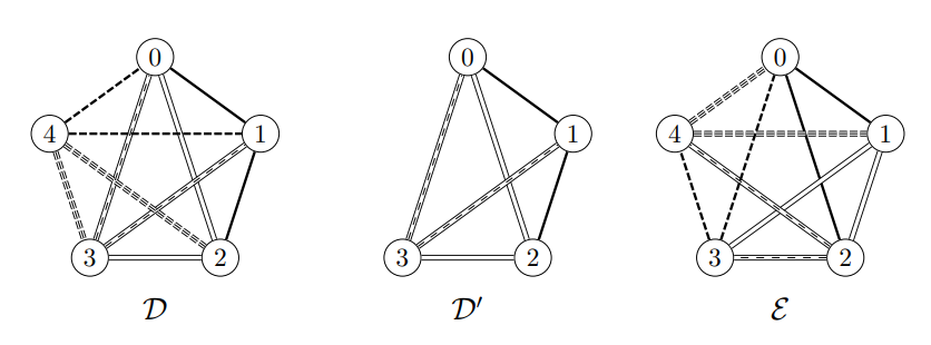 Example 2.3. Let \(G=K_5\) with \(V(G)=\mathbb{Z}_5\), and let \[\begin{align*} \mathcal{D}&=\{(1;\{0,2\}),(2;\{0,3\}),(3;\{0,1\}),(4;\{0,1\}),(4;\{2,3\}), \text{ and}\\ \mathcal{E}&=\{(0;\{1,2\}),(1;\{2,3\}),(2;\{3,4\}),(3;\{4,0\}),(4;\{0,1\})\}. \end{align*}\]