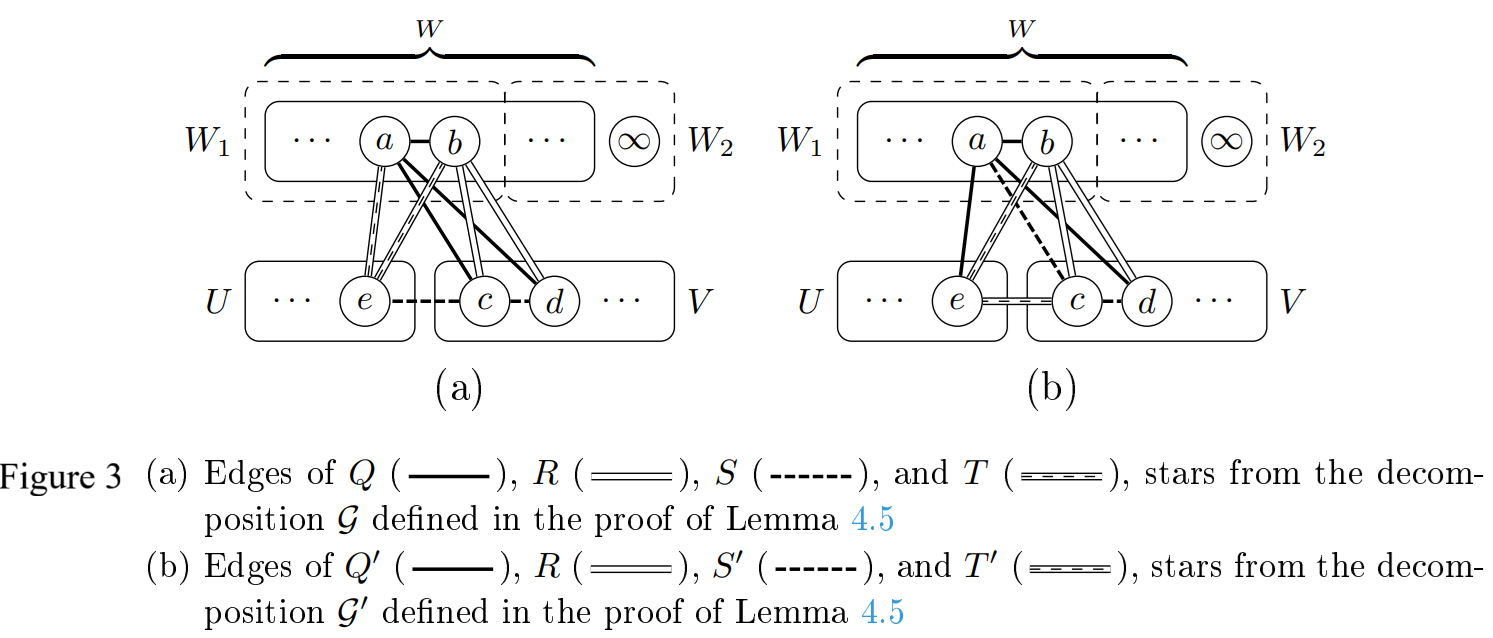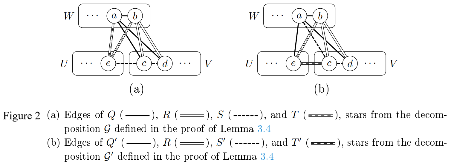 Similar to the proof of Lemma 3.4, let \(\mathcal{K}=\{Q,S,T\}\), and define \(\mathcal{K}’\) as the set of subgraphs \(\{Q’,S’,T’\}\), where \(Q’\), \(S’\), and \(T’\) are defined as given in (3). See Figure 3(b). Again, we define \(\mathcal{G}’=(\mathcal{G}\backslash\mathcal{K})\cup\mathcal{K}’\), and we now show that \(\mathcal{G}’\) is a primitive \(m\)-star decomposition of \(K_{a+2m}\). Similar to the proof of Lemma 3.4, we need only to demonstrate that (d) and (e) of Lemma 2.8 are satisfied.