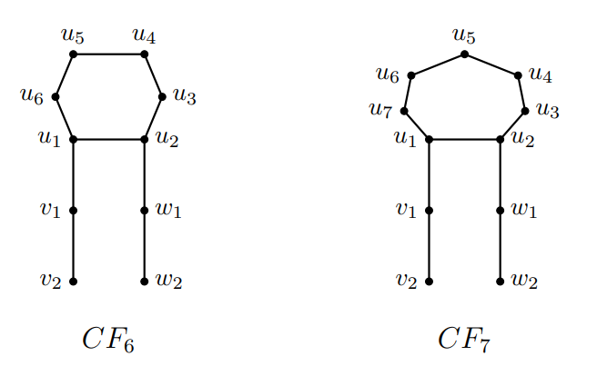 We will denote our infinite family of graphs satisfying \(f_d(G,v)< f_p(G,v)\) by \(CF_n\) and refer to them as cuttlefish graphs. \(CF_n\) contains a single cycle of length \(n\) with vertices around the cycle as denoted by \(u_i\) for \(1\le i \le n\) and edges \(u_iu_{i+1 \mod n}\). We then append two paths of length \(\left\lfloor\frac{n}{2}-1\right\rfloor\) to \(u_1\) and \(u_2\). We will denote the new vertices on the path appended to \(u_1\) by \(v_i\) for \(1\le i \le \left\lfloor\frac{n}{2}\right\rfloor-1\) where \(u_1v_1\) and \(v_iv_{i+1}\), for \(1\le i \le \left\lfloor\frac{n}{2}\right\rfloor-2\) are all edges. Similarly, we will denote the new vertices on the path appended to \(u_2\) by \(w_i\) for \(1\le i \le \left\lfloor\frac{n}{2}\right\rfloor-1\) where \(u_2w_1\) and \(w_iw_{i+1}\), for \(1\le i \le \left\lfloor\frac{n}{2}\right\rfloor-2\), are all edges. For ease of notation let \(u_1=v_0\) and \(u_2=w_0\). Note that \(CF_n\) will have \(n+ 2\left(\left\lfloor\frac{n}{2}\right\rfloor-1\right)\) vertices and edges.