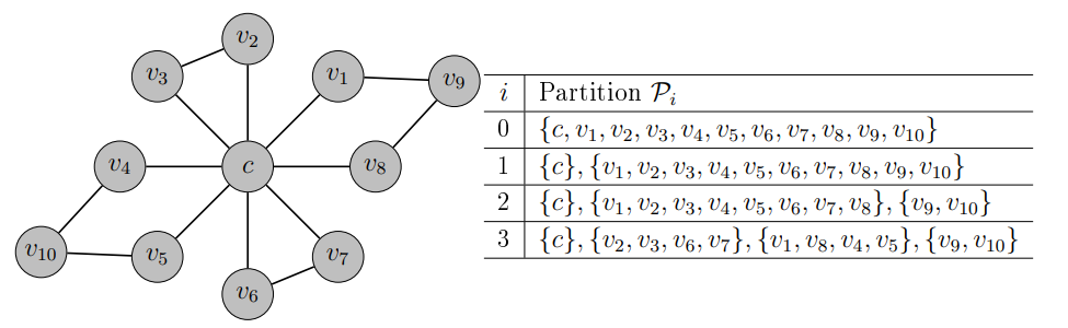 Let \(G\) be a graph. A partition of \(V(G)\) is a collection of its subsets \(\mathcal{P} = \{V_1, V_2, …, V_k\}\) such that \(\bigcup_{1 \leq i \leq k} V_i = V(G)\) and \(V_i \cap V_j = \emptyset\) for \(i \neq j\). Each element of the partition is called a cell. A partition is discrete when each one of its cells has size one. Given partitions \(\mathcal{P}_1 = \{V_1, V_2, …, V_k\}\) and \(\mathcal{P}_2 = \{W_1, W_2, …, W_\ell\}\), we say \(\mathcal{P}_1\) is coarser than \(\mathcal{P}_2\) if for each \(W_j\) there is a \(V_i\) so that \(W_j \subseteq V_i\) and \(k < \ell\).