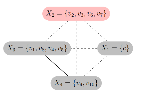 We know that \(H = J_i[R_i]\). The type of cell \(R_i\) is and its size allows us to determine \(D(H)\). If \(R_i\) is a homogeneous vertex, then \(J_i[R_i]\) is a complete graph so \(D(H) = |R_i|\). Otherwise, \(R_i\) is a heterogeneous vertex. If \(|R_i| = 5\), then \(J_i[R_i]\) is a 5-cycle so \(D(H) = 3\). If \(|R_i|\) is even, then \(J_i[R_i]\) is the complement of a matching graph \(rK_2\) with \(r = |R_i|/2\). But \(D(\overline{rK_2}) = D(rK_2) = \min \{c: \binom{c}{2} \ge r\}\) and can be computed in \(O(\sqrt{r})\) time (see appendix of [15]). Thus, given \(A_i\), we can obtain both \(D(H)\) and \(D((L_v, \mathcal{P}_G),c)\) in time linear in the size of \(G_i\). Finally, we can use binary search over the range \([1, n]\) to find the minimum \(c\) so that \(D((L_v, \mathcal{P}_G),c) \ge D(H)\). Thus, \(D(G_i, \mathcal{P}_G)\) can be computed in \(O(n_i \log n_i)\) time where \(n_i = |V(G_i)|\).