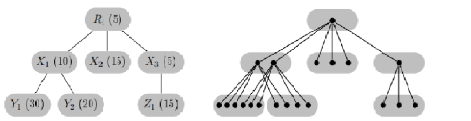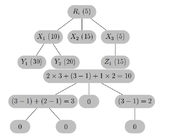 Given \(A_i\) and the sizes of the cells in \(A_i\), here now is the algorithm for computing \(D((L_v, \mathcal{P}_G), c)\): Run a postorder traversal on \(A_i\). At each cell \(X\), compute \(D((L_x, \mathcal{P}_G), c)\) where \(x \in X\). Thus, when \(X\) is a leaf, set \(D((L_x, \mathcal{P}_G), c) = c\), the base case. When \(X\) has \(Y_1, Y_2, …, Y_\ell\) as its children, compute \(m_j = |Y_j|/|X|\) for each \(j\). Then apply equation (1) to obtain \(D((L_x, \mathcal{P}_G),c)\). Eventually, when the postorder traversal makes its way back to \(R_i\), the result will be \(D((L_v, \mathcal{P}_G), c)\). Since time spent at each vertex \(X\) of \(A_i\) is linear in the number of children of \(X\), it follows that the postorder traversal runs in time linear in the size of \(A_i\).