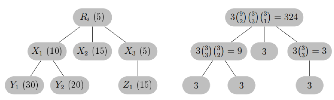 When \(y, y'\) are children of \(x\), the subtrees \(L_y\) and \(L_{y'}\) are cell-isomorphic if and only if \(y\) and \(y'\) are from the same cell \(Y_j\). The forward direction is obvious; the backward direction is from the proof of Theorem 4.1. Thus, \[\mathcal{T} = m_1 L_{y_1} \cup m_2 L_{y_2} \cup \cdots \cup m_\ell L_{y_\ell},\] where \(y_j \in Y_j\) and \(m_j = |Y_j|/|X|\) for \(j = 1, …, \ell\). The value of \(m_j\) follows from the fact that the bipartite graph induced by \(J_i[X, Y_j]\) is of the form \(sK_{1,t}\) so every vertex in \(X\) has \(|Y_j|/|X|\) neighbors in \(Y_j\). Applying Theorem 2.5, \[\label{newformula} D((L_x, \mathcal{P}_G),c) = c \prod_{j = 1}^\ell \binom{D((L_{y_j}, \mathcal{P}_G),c)}{m_j}. \tag{1}\]