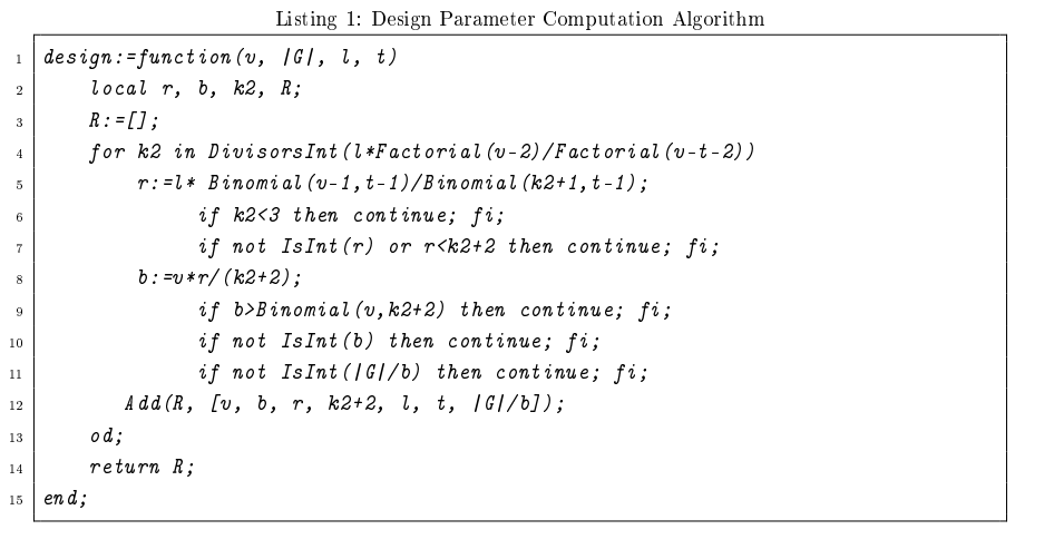 Apart from the Monster group \(M\), we can obtain all possible parameters \((v, b, r, k)\) with the aid of the following Algorithm 1 in computer algebra system GAP [23].