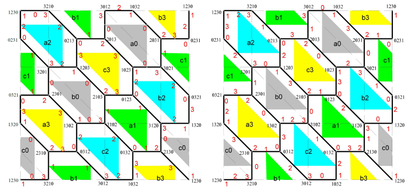 Figure 2 shows a modification of Figure 1 stressing the difference between the two vertex-fixed edge-orthogonal colorings of Theorem 2.3 by means of colored triangles whose vertices are the midpoints of edges with a common color number, such that on the left of the figure these triangles are pointing down while on the right they are pointing up. The colors of these triangles are; light-gray in \(\rm a0,b0,c0\); light-green in \(\rm a1,b1,c1\); light-blue in \(\rm a2,b2,c2\); yellow in \(\rm a3,b3,c3\).