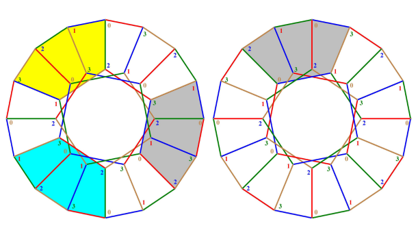 A pair of orthogonal EpGTC for the generalized Petersen graph \(GP(8,3)\) is shown in Figure 3, where in either case there are four of each of the following vertex-color 6-cycles: \[\begin{aligned} \label{pg83}(012013),(023021),(031032),(120123),(130132),(230231), \end{aligned} \tag{1}\] with for example a case each of color cycles \((012013)\), \((023021)\) and \((023021)\) represented in the figure with “apparent face interior” in area color yellow, blue and gray, respectively.