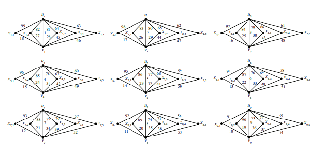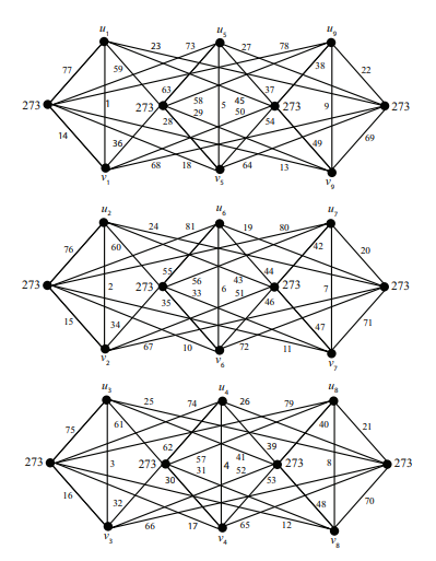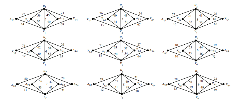 Example 2.10. Using the \(3(3P_2\vee O_3)\) in Example 2.8, we may let \(x\) be the vertex adjacent to \(u_1\), \(v_1\) and \(x'\) be the vertex adjacent to \(u_7\), \(v_7\), satisfying \(f(xu_1) + f(xv_1) = f(x'u_7) + f(x'v_7) = 91\) and \(x,x'\) do not have common neighbors. Note that this graph is not a possible graph of \(\mathcal G_4(3,3)\) since two of the degree 6 vertices are obtained by merging vertices with induced vertex labels in \(\{f^+(x_{7,4}), f^+(x_{5,1}), f^+(x_{9,1})\}\) and \(\{f^+(x_{1,1}), f^+(x_{2,4}), f^+(x_{6,4})\}\) which are not subsets of \(S_1\) nor \(S_4\).