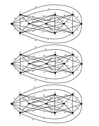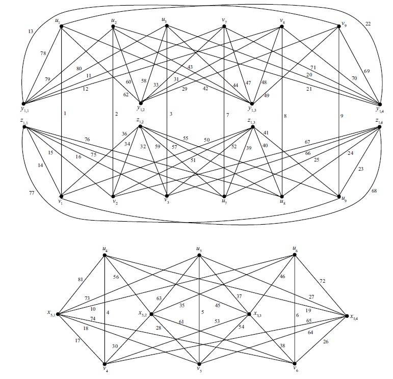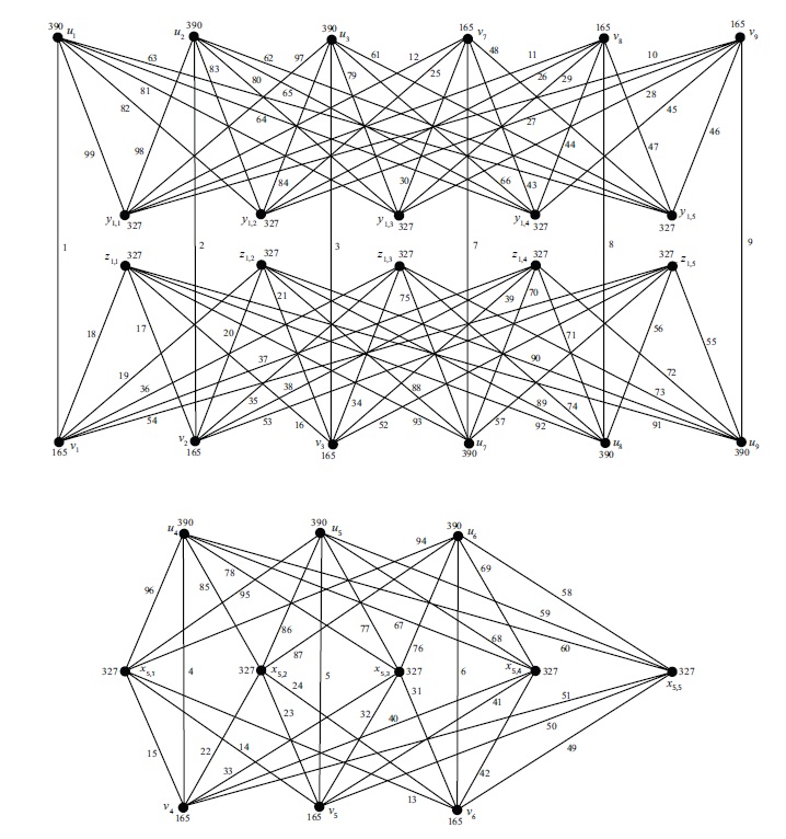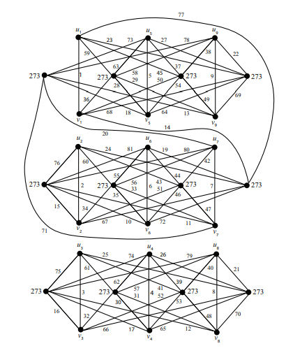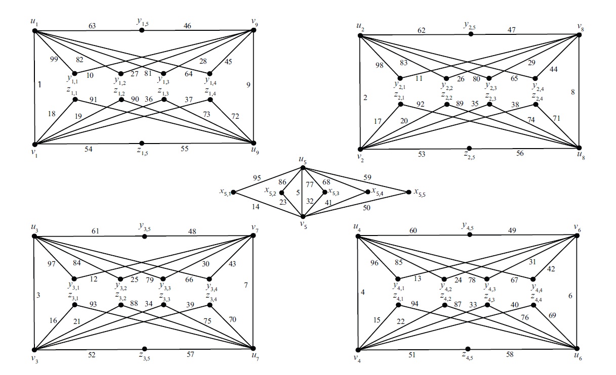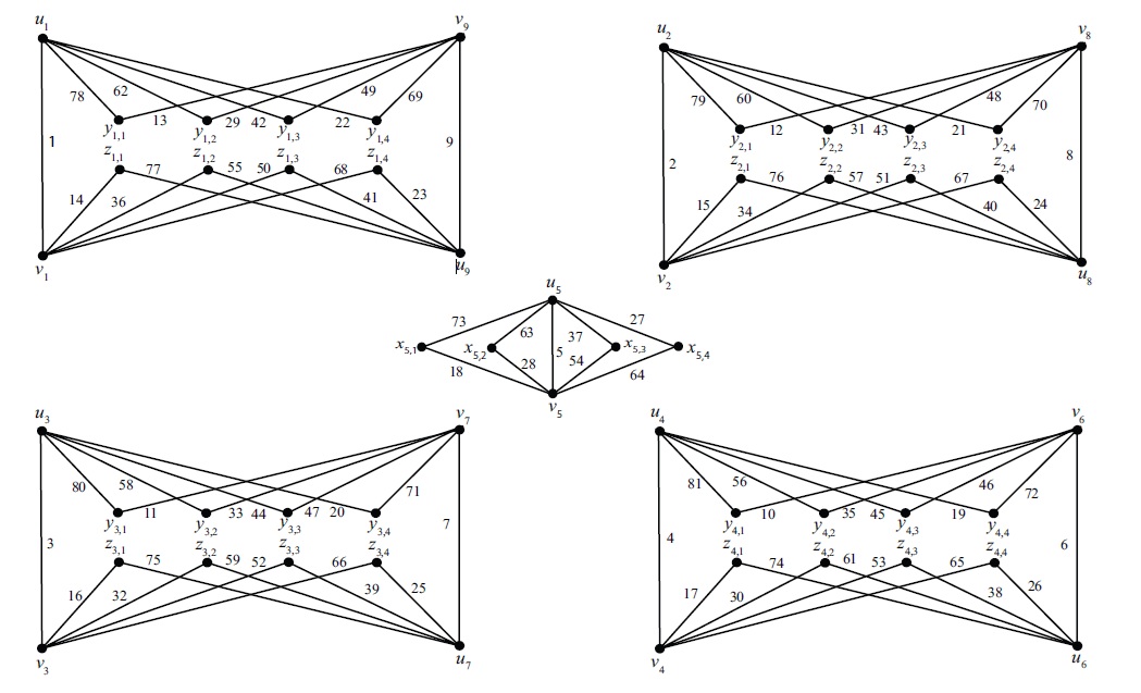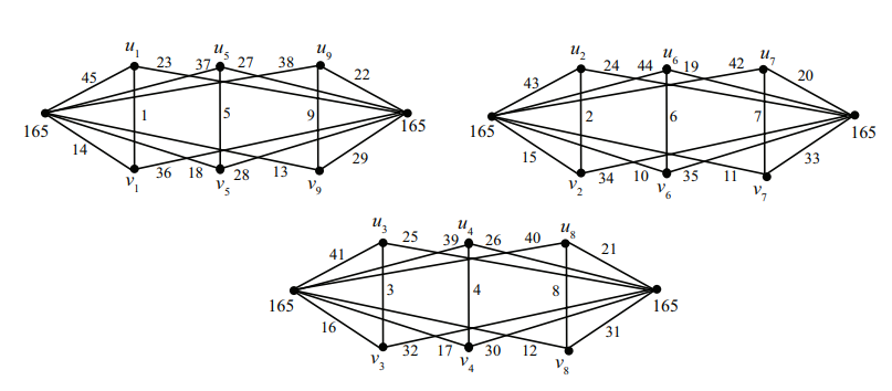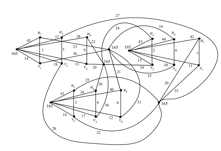 Example 4.3. Consider \(n = 2\), \(k=4\) again. Now we have \(r=s=1\). Consider the graph \(G=G_{2n}(k+1)\). Now \(V(G)=\{u_i, v_i\;|\; 1\le i\le 9\}\cup\{y_{i,j}, z_{i,j}\;|\; 1\le i\le 4, 1\le j\le 4\}\). From Observation (d) we have \[\begin{aligned} f^+(y_{1,j})+f^+(y_{2,j})+f^+(y_{3,j}) &=[f(u_1x_{1,j})+f(v_9x_{9,j})]+[f(u_2x_{2,j})+f(v_8x_{8,j})]\\& \quad +[f(u_3x_{3,j})+f(v_7x_{7,j})]=273,\\ f^+(z_{1,j})+f^+(z_{2,j})+f^+(z_{3,j}) & =[f(v_1x_{1,j})+f(u_9x_{9,j})]+[f(v_2x_{2,j})+f(u_8x_{8,j})]\\& \quad+[f(v_3x_{3,j})+f(u_7x_{7,j})]=273,\\ f^+(y_{4,j})+f^+(x_{5,j})+f^+(z_{4,j}) &=[f(u_4x_{1,j})+f(v_6x_{2,j})]+[f(u_5x_{5,j})+f(v_5x_{5,j})]\\& \quad+[f(u_6x_{6,j})+f(v_4x_{4,j})]=273. \end{aligned}\]