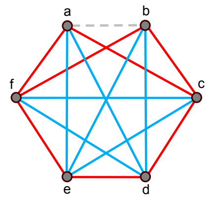 Now consider the possibility that \(bc\) is blue. Then \(bf\) and \(be\) must be red, and \(\{b,e, f\}\) induces a red \(K_3\). It follows that \(bc\) must be red, \(bd\) must be blue, \(bf\) must be red, and \(be\) must be blue, resulting in the coloring shown in Figure 1. ◻
