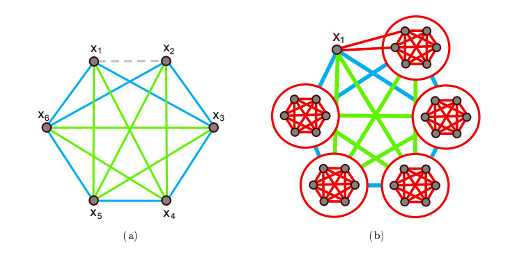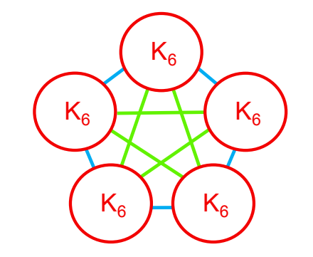 When \(t=3\), we will represent colors \(1\), \(2\), and \(3\), by red, blue, and green, respectively. The critical coloring for \(gr(F_{3,2}, K_3, K_3)=31\) that was given in [2] was formed by taking the unique critical coloring for \(r(K_3, K_3)\) (a \(K_5\) containing a blue \(C_5\) and a green \(C_5\)) and replacing each of its vertices with a red \(K_6\)-subgraph (see Figure 2). We refer to this critical coloring for \(gr(F_{3,2}, K_3, K_3)\) as \(\mathcal{G}\).