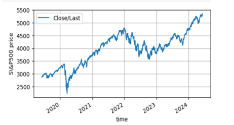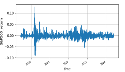 We took a historical trading days time series data of S&P500 stock closed price from 2019-06-07 to 2024-06-06 which has a total of 1259 samples. For simpler statistical analysis and stationarity this data is changed into log retuns. Furthermore, it splits into 2019-06-10 to 2023-03-08(944) for training, 2023-03-09 to 2023-10-30 (163) for validation and 2023-10-31 to 2024-06-06 (151) for test(out samples).