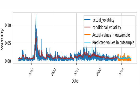 The performance of the model’s volatility forecasting is measured by comparing the forecasted volatility with the realized volatility in the out sample data using the metrics mean square error(MSE), root mean square error (RMSE) and the mean absolute error (MAE). MSE describes the average of the difference squares in the observed and predicted volatility. RMSE indicates the magnitude of the error in square root of the average square of the predicted and observed values, where as MAE shows the magnitude of absolute difference average of predicted and observed value. These equations are as follows: