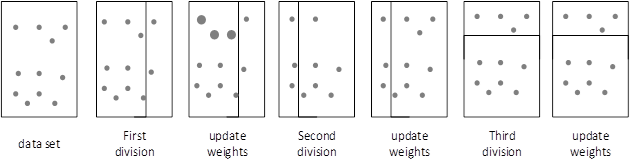 The Adaboost algorithm also establishes multiple basic models and then concatenates them one by one. The algorithm calculates the model sample score one by one, and then makes a simple judgment on the model sample score. If it is correct, it would reduce its weight and reduce the attention to the model. If it is wrong, its weight is increased and the attention of the model is increased. This continues until the final result is obtained, and the output of the algorithm is closer to reality. The Adaboost algorithm calculates and judges the weight of the basic model as shown in Figure 2.