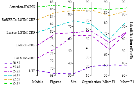The results of the comparison experiments of named entity recognition models are shown in Figure 1. The Attention-IDCNN model in this paper is significantly better than the other models, with 87.14%, 84.94%, and 83.16% naming recognition effects on characters, locations, and organizations, while the micro-averaged Mic-F1 value and macro-averaged Mac-F1 value are 86.44% and 85.17%, respectively.