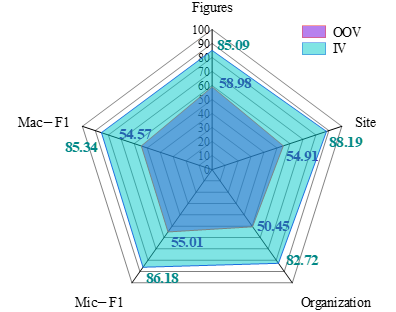 The experimental results of the entities of OOV and IV are shown in Figure 2. The recognition effect of Attention-IDCNN model for OOV entities in this paper is lower than that of Experiment 1. Because the location and organization entities in ancient literature are more complex and variable, the entities of different topics are more different, and these two types of entities are more likely to confuse the boundaries, so the recognition effect of OOV entities is poorer, with a recall rate of 54.91% and 50.45%, respectively, and the recognition effect of character OOV entities is better than location and organization entities, with a recall rate of 58.98%. The recognition effect of the model for IV entities is comparable to that of Experiment 1, in which the recognition effect of character and location IV entities is better, with the recall rate of 85.09% and 88.19%, respectively, and the recognition effect of organization IV entities is worse, with the recall rate of 82.72%.