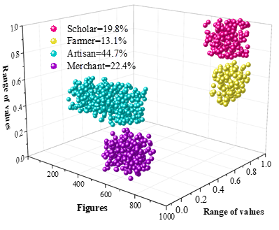 The naming recognition model recognizes more than 83% of the characters, place names and organizations in the sample literary works, and its Mic-F1 and Mac-F1 values are above 85%, reflecting a good entity recognition effect. Using it to analyze the sample corpus of Ming Dynasty novels, artisans (44.7%) and merchants (22.4%) account for a higher percentage in character recognition, and urban locations account for 74.6% in location recognition. This reflects the social and cultural background of the prosperous development of the commodity economy and the expansion of the civic class at that time.