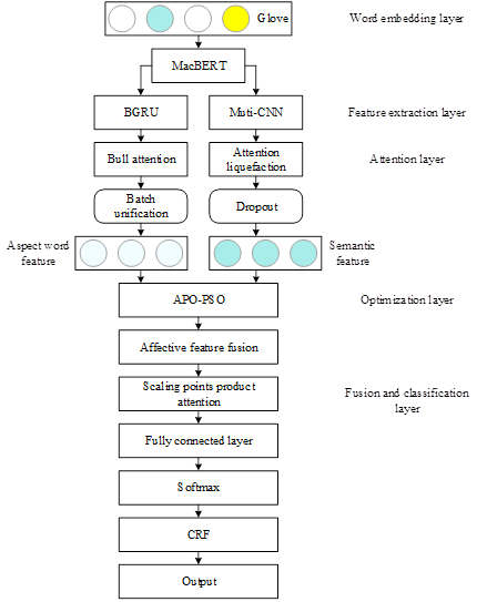 The overall structure of the MacBERT-DATT model is shown in Figure 5. The model consists of five layers: word embedding layer, feature extraction layer, attention layer, optimization layer, fusion and classification layer. Among them, the word embedding layer consists of the pre-trained Glove model, the feature extraction layer consists of the MacBERT pre-trained model, the BGRU unit and the multi-granularity convolutional network in parallel, the attention layer includes the multi-head attention mechanism and the attention pooling mechanism, the optimization layer consists of the APS-PSO algorithm, and the fusion and classification layer consists of the feature fusion layer, the scaled dot product attention mechanism, and the fully connected layer, Softmax and CRF networks.