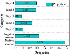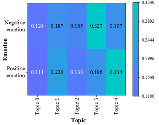 Figure 6c shows the distribution of emotion-themes in the sample Tang Dynasty poems, and it can be seen that the themes with the highest frequency of co-occurrence with the theme of positive feelings are Theme 4-War to Serve the Nation (0.334) and Theme 1-Farewell Sentiments (0.226), which are about serving the country with high passion and sending off friends to encourage each other. “Men and do not bring the Wu Hook, collect Guanshan fifty states”, describes the war but positive surging, patriotic feelings overflowing.