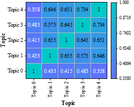 Figure 6b shows the theme-theme distribution of the sample poems of the Tang Dynasty, in which themes 0\(\mathrm{\sim}\)4 are Other, Farewell, Difficult to Reward, Wandering in a Hometown, and War of Serving the Nation, respectively. Theme 4 – war for the country and theme 3 – wandering away from home have the highest co-occurrence frequency of 0.734. The Tang Dynasty was so powerful that it wiped out the Eastern Turkey, Western Turkey, Gaochang and Gowenli successively, realizing the real “ten thousand countries coming to the imperial court”. Border poetry has always been an important part of the theme of the Tang Dynasty, and Wang Wei, the “Poetry Buddha”, and Wang Changling, the “Sage of Seven Styles”, are typical representatives of border poetry.