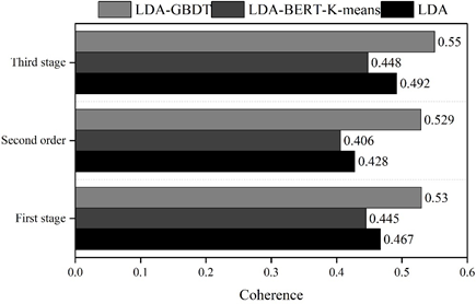 The coherence of each theme under LDA-GBDT is 0.53, 0.529, and 0.55, respectively, while the coherence of other theme classification models is below 0.5.