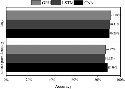The accuracy evaluation of the three validation models is shown in Figure 2. Using the word vector training model obtained from skip-gram model training, the accuracy of the model obtained using ordinary word vector training is 88.59%, 86.32%, and 86.97%, respectively, as verified by convolutional neural network, long and short-term memory network, and GRU neural network. Taking this as a benchmark, the accuracy rates of the models obtained by training the emotion word vectors under the method of this paper are 90.26%, 90.41%, and 91.48%, respectively, which indicates that the method of automatically constructing the domain emotion dictionary using the SO-PMI algorithm, and adding the emotion information in the domain emotion dictionary to the word vectors is feasible and effective.