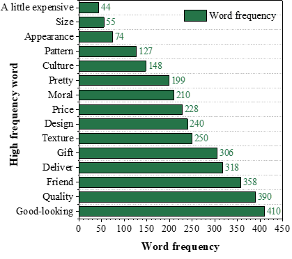 In the emotional value dimension, consumers pay the most attention to the pursuit of aesthetics, so a large number of words describing the appearance design of mango weaving products appear, such as good-looking, exquisite, and beautiful. In addition, the storytelling of mango weaving products, i.e., the cultural connotations embedded in them, also receives a certain amount of attention, with high-frequency words such as moral, culture, and ruyi reflecting consumers’ perceptions of the cultural significance and values attached to mango weaving products.