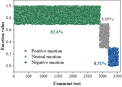 The review text of mango knitting is divided into five themes such as appearance design, quality workmanship, cultural connotation, product price, and social interaction, with probability values ranging from 0.181 to 0.227, among which the probability value of appearance design, which corresponds to the emotional value, is the largest, which indicates that consumers are more concerned about the appearance, quality, social attributes, and price of mango knitting. 82.6% of the review texts of mango knitting are positive emotions, and most consumers are more satisfied with mango knitting. The authors of mango knitting should pay attention to the emotional value of mango knitting, improve the quality of products, optimize the pricing strategy, and enhance the consumers’ experience needs and satisfaction, so as to achieve the sustainable development of mango knitting.