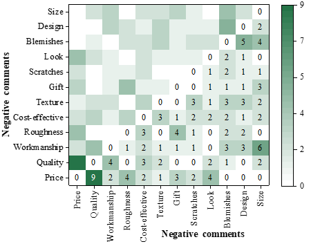 The co-occurrence matrix of negative review words for Mango Editor products is shown in Figure 5. The frequency of co-occurrence of negative review words of mango knitting products ranges from 0 to 9. The word co-occurrence matrix of negative texts indicates that consumers’ negative emotions mainly stem from the basic attributes of the product and the dimensions of functional quality and functional value. First, the pricing of mango knitting products is questioned, with a high co-occurrence of price and quality, reflecting that some consumers believe that mango knitting products are not worth the current pricing. Second, some consumers’ negative emotions are related to the workmanship of mango-woven products. The high frequency of co-occurring words such as roughness, scratches, defects, and size indicate that some consumers are disappointed with the quality of the mango weaving products they purchased.