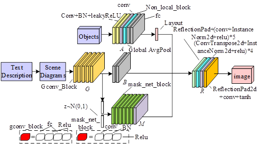 The network consists of several subcomponents:(1) Graph Convolutional Network (G), which is responsible for converting the input scene graph into embedding vectors for each object based on their positions. (2) Convolutional neural network (M), which is responsible for converting the layout embedding vectors and random embedding vectors of the objects into the corresponding masks. (3) A parallel network (B), which is responsible for converting the layout embedding vectors of an object into bounding box positions. (4) An appearance decoder (A), responsible for converting the image information into the corresponding embedding vectors. (5) An encoder-decoder network (R), responsible for generating the final image.