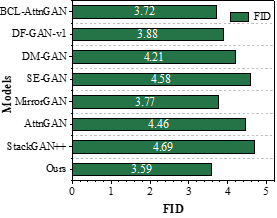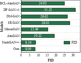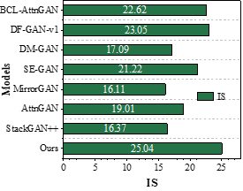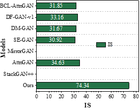 Numerical experimental quantitative analysis of the results for the text-image generation task. The performance of the model is compared with several text-generated image models on dataset CUB and dataset COCO through FID and IS metrics. The results of different models for generating image quality are shown in Figure 7a to 7d are the FID and IS results of the models on dataset CUB and dataset COCO.