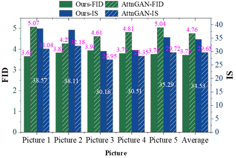 The comparison of the computational scores of the images generated by this paper’s lightweight generative adversarial network model based on the nonlocal attention mechanism and other models on the CUB dataset shows that the FID and IS values of this paper’s model are 3.59 and 25.04, respectively, and the IS metrics values of the images generated by this paper’s model are increased by 6.03, or 31.72%, when compared with the baseline model, AttnGAN. The value of FID metric decreased by 0.87 or 19.51%. From the comparison on the COCO dataset, it can be seen that the FID and IS values of this paper’s model are 8.09 and 74.34, respectively, and the values of IS metrics and FID metrics are increased and decreased by 115.67% and 57.91%, respectively, when compared with the baseline model AttnGAN. From a quantitative point of view, the effectiveness of the text-generated image model in this paper is proved.