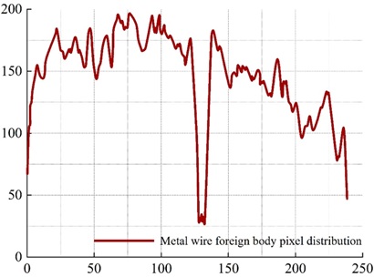 Figure 3 shows the distribution curve of pixel values in the rows without foreign matter, and Figure 4 shows the distribution curve of pixel values in the rows of metal wire foreign matter. There is a significant fluctuation around 128 to 136.