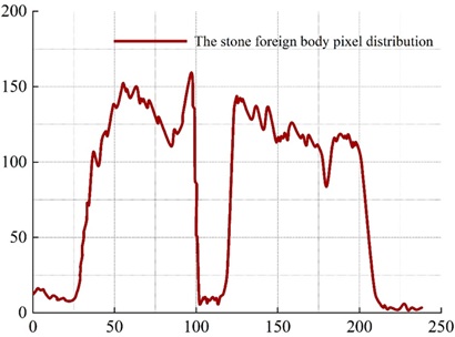 Figure 5 shows the distribution curve of pixel values in the no foreign body row and Figure 6 shows the distribution curve of pixel values in the stone foreign body row. A significant fluctuation around 101 to 119 can be clearly seen in Figure 6.
