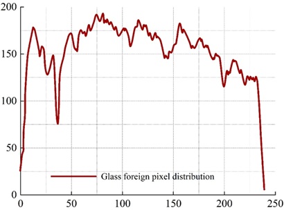 Figure 7 shows the distribution curve of pixel values in the no foreign body row and Figure 8 shows the distribution curve of pixel values in the glass foreign body row. A significant fluctuation around 31 to 37 can be clearly seen in Figure 8.