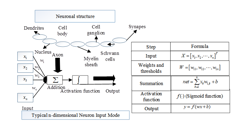 As in Table 1, \(i=1,…,n;j=1,…,p;t=1,…,q\), the activation function \(f(\cdot )\) is generally used as Sigmoid function, then it can be expressed by Eqs. (1) and (2), respectively: \[\label{GrindEQ__1_} S_{j}^{k} =\sum _{i=1}^{n}w_{ij} x_{i} -\theta _{j} ,\tag{1}\] \[\label{GrindEQ__2_} b_{j}^{k} =f\left(S_{j}^{k} \right)=\frac{1}{1+e^{-S_{j}^{k} } } .\tag{2}\]