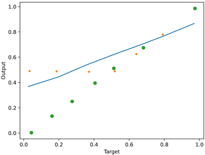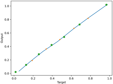 As shown in Figure 3 and Figure 4, the optimization speed of BP network is much faster than that before optimization. In addition, the average error of the optimized neural network is 8.3164\(\mathrm{\times}\)\(10^{-6}\), and the average error of the 389 step pre-optimized neural network is 9.9408\(\mathrm{\times}\)\(10^{-6}\), which reflects the efficiency and accuracy of the neural network after particle swarm optimization. This \(R\) value represents the linear relationship between the target value and the output intensity. In Figure 4, \(R\)-value in the BP network is 0.89856, and \(R\)-value in Figure 5 is 099999, indicating that the optimized BP network more accurately reflects the regression relationship between output and target.