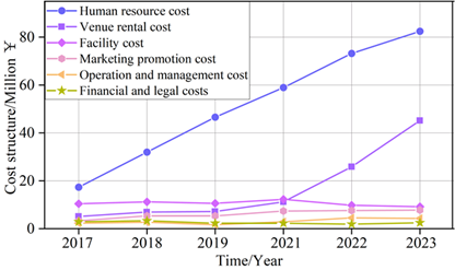 HB’s revenue sources are mainly composed of three parts: venue operation revenue, sports training revenue, and activity revenue. The revenue share of each part is shown in Figure 9, of which part of the data is not included in the study because the company as a whole is in a state of shutdown due to the epidemic during the period of 2020-2021.In 2021, as the training business is in a state of shutdown, the revenue from this business only accounts for about 1%. It can be seen that the proportion of sports training revenue in the total revenue gradually increases to 80.5%.