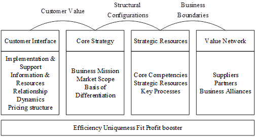 The four elements are connected by three “bridge-like” elements: customer value, structural configuration, and enterprise boundary, which is why the model is called the “bridging model”. Customer value is to solve what products (services) to provide to customers, through the structure of the allocation of the company’s core resources to maintain the key strategy, and finally through the corporate boundaries of the bridge to solve the external cooperation and upstream and downstream relationship between the enterprise resources. All of this is based on four elements: efficiency, uniqueness, matching, and profit-boosting tools.