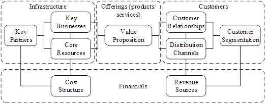 The third stage that the business model of the sports industry enters is also called the network modeling stage. The model is refined and organized from 14 kinds of business model elements to form a system of 9 elements, and the business model of the sports industry at this stage is called BML model as shown in Figure 3. The model is relatively comprehensive to sort out the business model elements, and more practical to respond to all aspects of the business behavior of enterprises. Among them, it includes four segments, namely infrastructure, finance, product (service) provision and customers, as well as nine major elements to comprehensively show the whole process of business. The model is also the most widely used business model by major sports enterprises. However, the model has many elements, presenting a “fruit basket” structure, which only lists the elements and does not reflect the specific internal logical relationship and influence relationship.