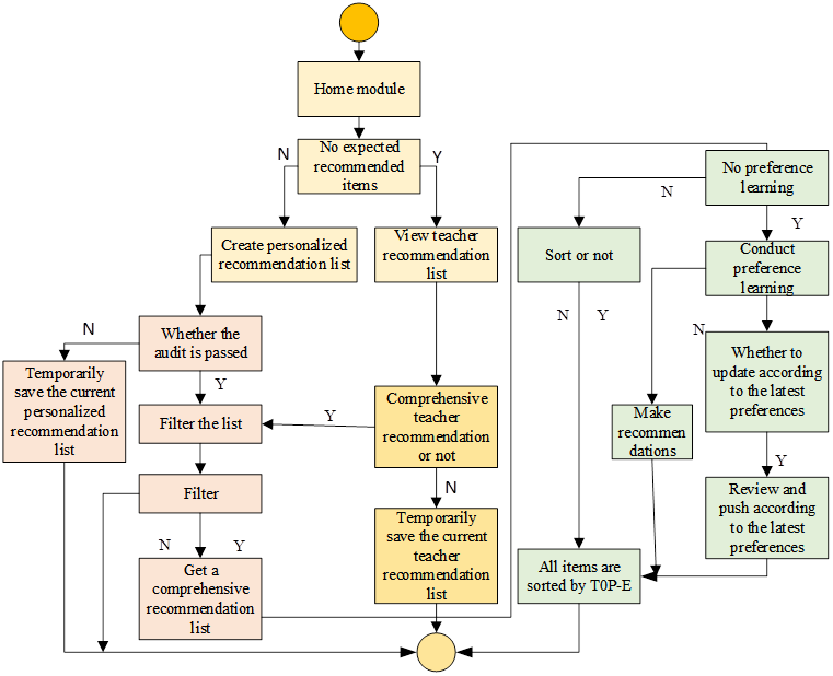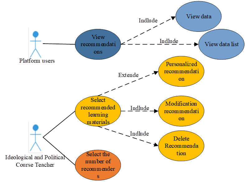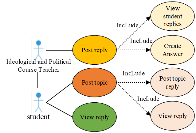 The teaching evaluation view is shown in Figure 5. The business activity diagram of the personalized recommendation module is shown in Figure 4. Students or teachers of ideological and political courses post topics and reply through the discussion function. The teaching evaluation view use case mainly includes the post topic use case. Post topic use cases include post reply, view reply, view topic list and other use cases. The use case diagram of the teaching evaluation module is shown in Figure 6.