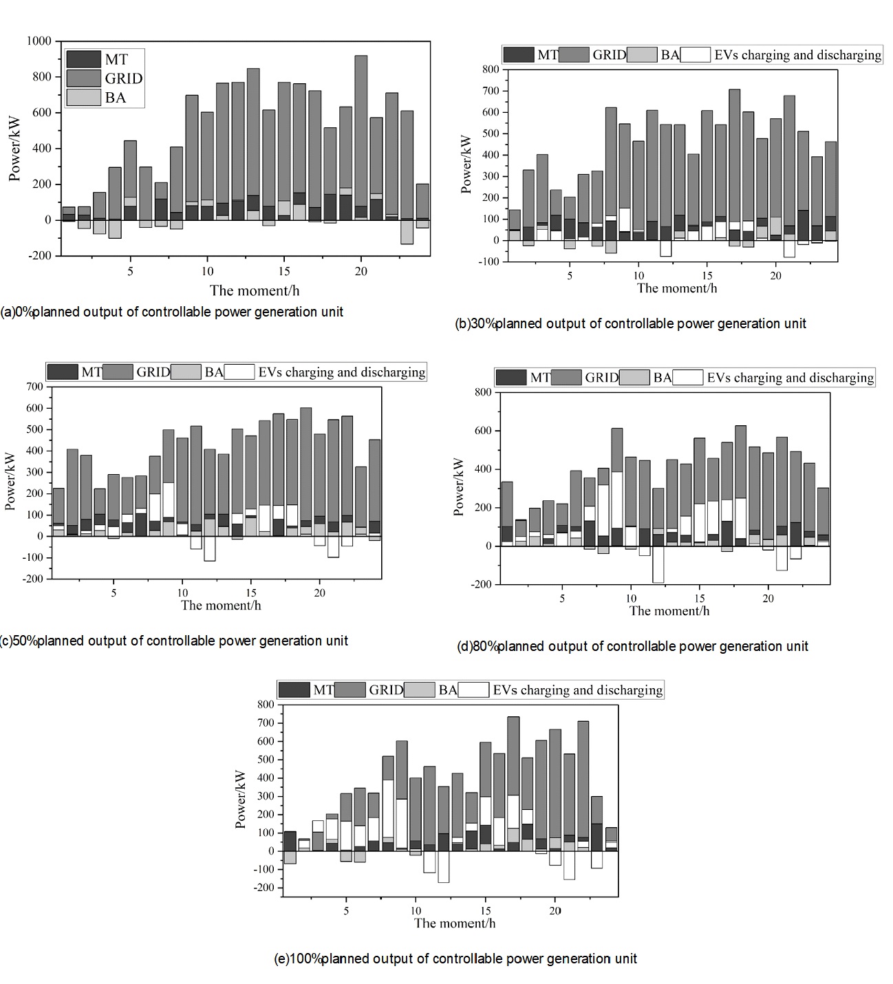 To study the power output of controllable generating units with different responsiveness, the user responsiveness in the region is selected as 0%, 30%, 50%, 80%, and 100%, and the operation results are shown in Figure 10, and the integrated operation and management costs of microgrids with different user responsiveness in 1 dispatch cycle are counted, and Figure 10(a)-(e) are 0%, 30%, 50%, 80%, and 100%, respectively. In the figure, MT is the microfuel engine, BA is the energy storage system, and GRID is the power curve of the public power grid. Table 1 shows the comparison of microgrid metrics with different user responsiveness.