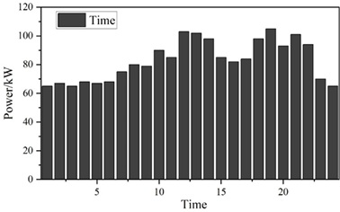 The daily load curve of a building is used for simulation verification, and the data are shown in Figure 3, which shows that the average daily load power of the power grid is 82.875 kW. For the convenience of calculation, it is assumed that 2,000 EVs of the same model are connected to the power grid, with driving consumption power of 8 kW, rated battery capacity of 40 kW/h, and maximum charging and discharging power of 15 kW, and the initial charge state of the incoming EV is 0.8, and the minimum charge state of outgoing EV is 0.9, which is required by users. The initial charging state of EVs entering the station is 0.8, and the minimum charging state of EVs leaving the station required by users is 0.9.